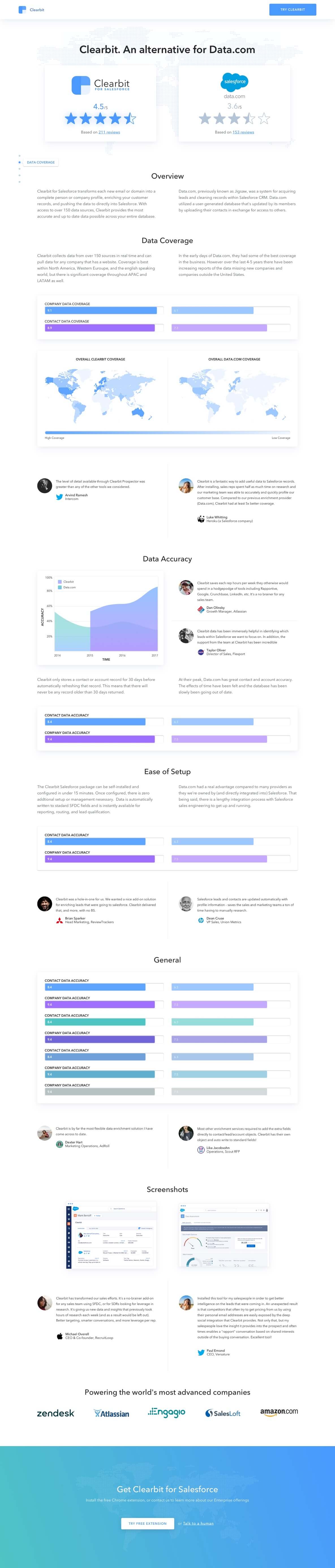 Working with Clearbit began, like all Zavzen projects, by developing a deep understanding of the organization, audience/users, and competitors. Zavzen discovered that the audience was primarily driven, young, and predominantly male salespeople and marketers. Digging deeper into their motivations informed us that design decisions had to appeal to both a logical focus on numbers as well as the passion for using the freshest tools and technology. Discussions with the organization revealed a number of customer acquisition channels. Clearbit reached their audience through inbound marketing, sales outreach, and a combination of paid and organic traffic. Having multiple touchpoints provided the potential for individual projects to serve as both conversion-focused landing pages and sales reference material.